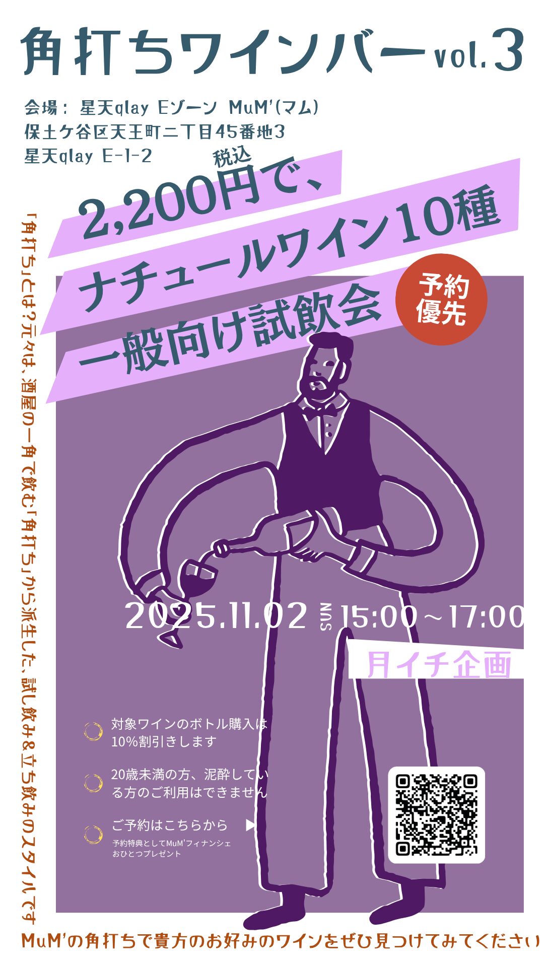 MuM’では11月2日(日)、専属のソムリエが10種類に絞ったおすすめワインを「角打ちスタイル」で楽しめるイベントを開催します。
